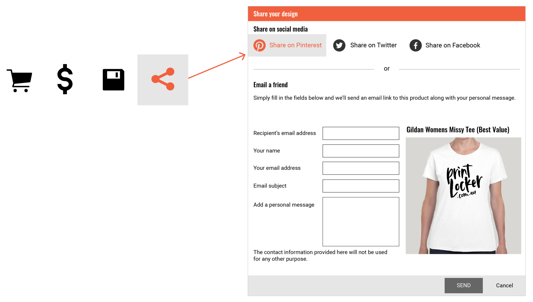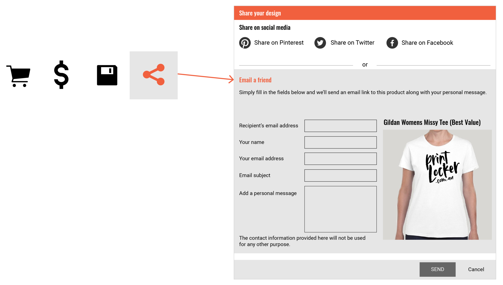 You can share your designs with friends and colleagues by clicking the share design icons in the bottom right corner of the design studio.