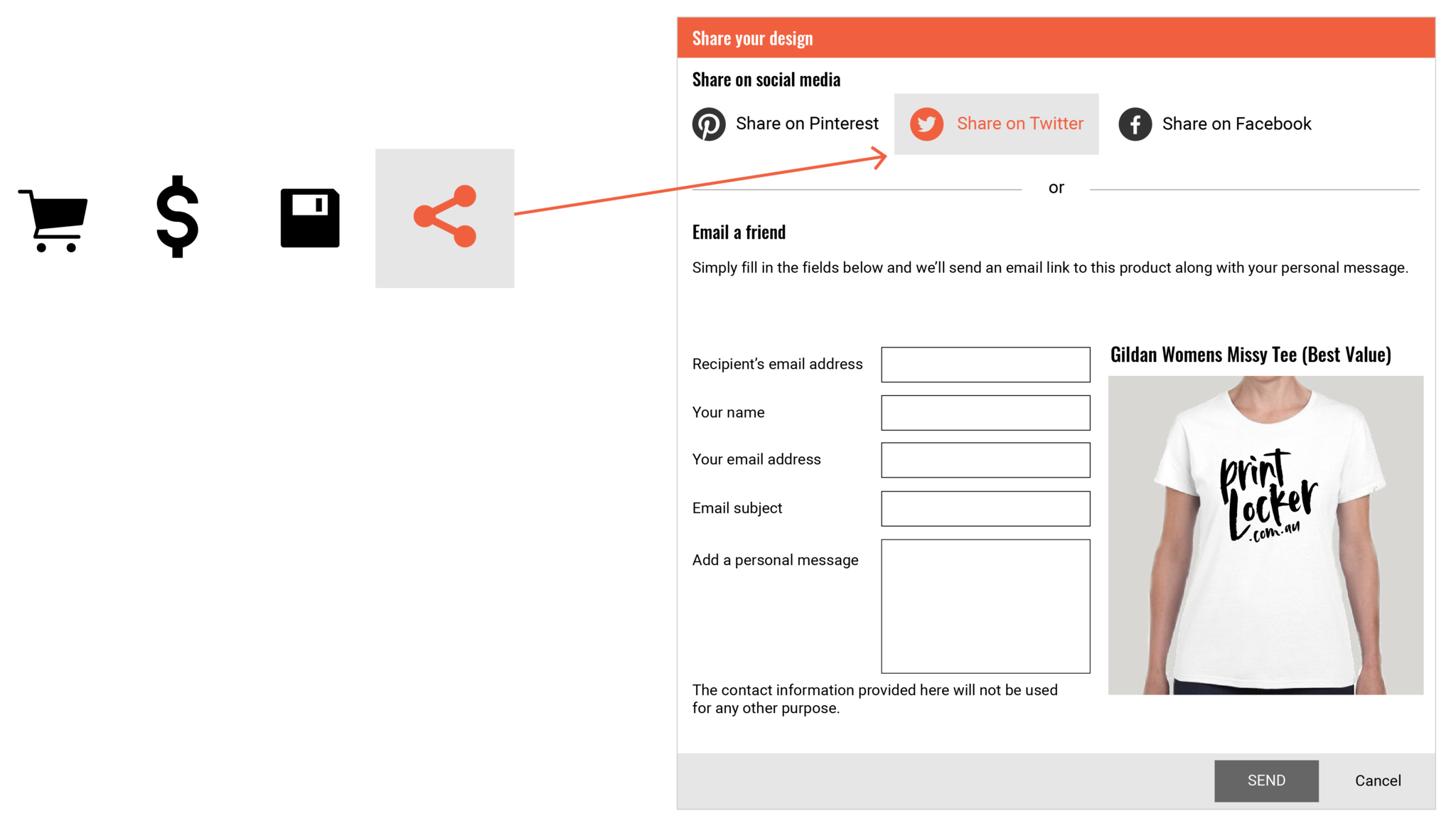Share a link to your design on Twitter by clicking the Twitter icon in the bottom right of the design studio.